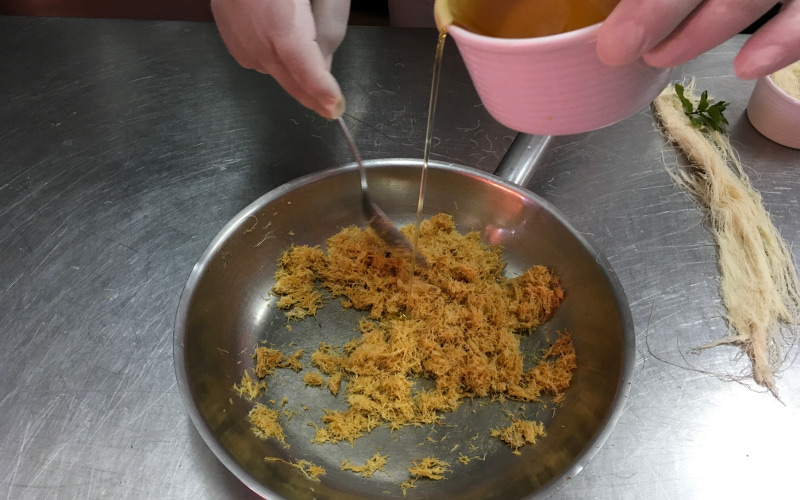 - Roast the Kunafa with clarified butter until it is golden and take it off the fire allowing it to cool down.
